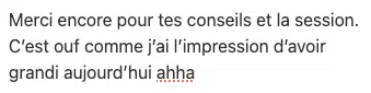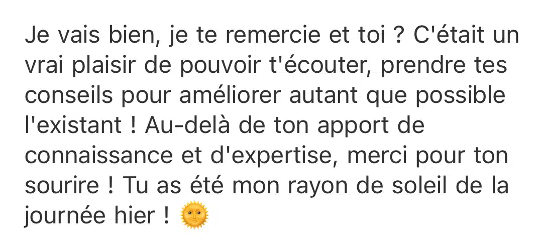 Tu as aussi un accompagnement stratégique sur 3 mois avec moi, en “permanence asynchrone” via notre espace Notion et un bilan en visio au 3ème mois pour garder le cap. Mon rôle, c’est d’être là quand tu hésites pour qu’on trace ensemble une trajectoire solide.