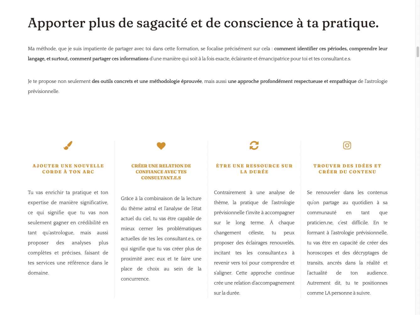 J’ai ensuite effectué une veille sectorielle pour m’assurer que la page de vente se démarquerait tout en répondant aux attentes de la cible. Le secteur de l’astrologie étant souvent entaché de clichés et de discours « New Age » peu crédibles dont Annabelle souhaitait à tout prix s’éloigner, j’ai travaillé sur un positionnement éditorial qui reflète son savoir-faire, sa légitimité et sa démarche rigoureuse. J’ai choisi des mots avec soin pour souligner le côté érudit et expert d’Annabelle, loin des discours simplistes et des approches superficielles courantes dans le domaine.